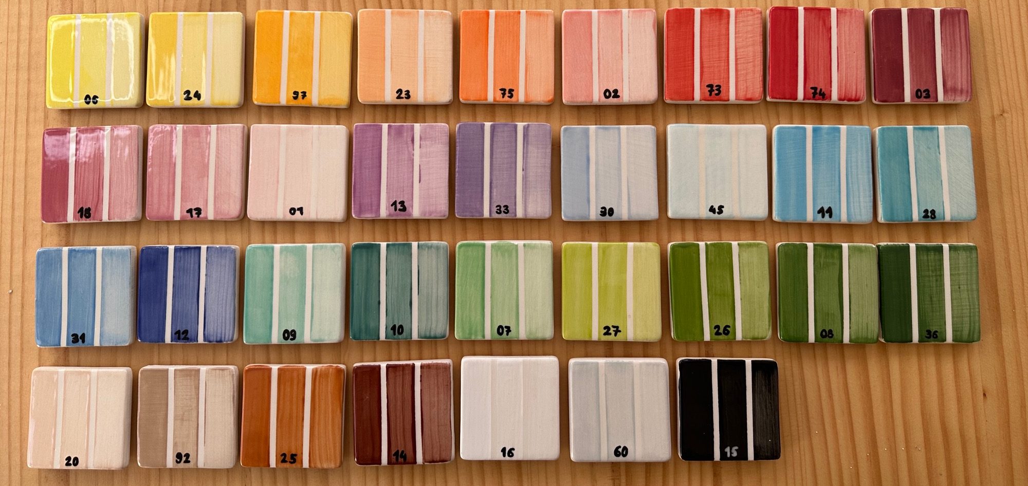 Wähle einfach deine gewünschten Glasurfarben aus und sende mir die Nummern. Gemeinsam vereinbaren wir einen Abholtermin im Studio. Ich stelle dir deine Farben zusammen, und vor Ort suchst du dir dann die passende Keramik aus.